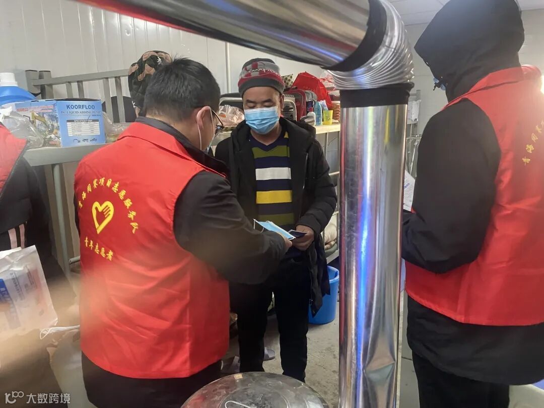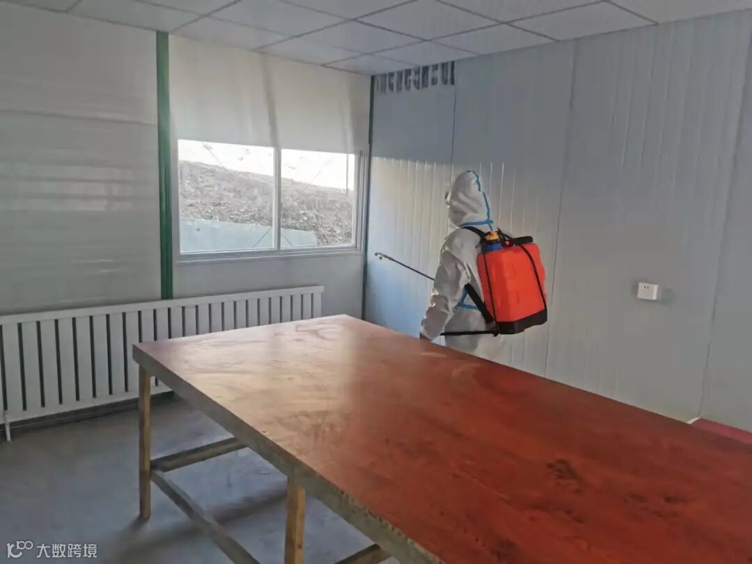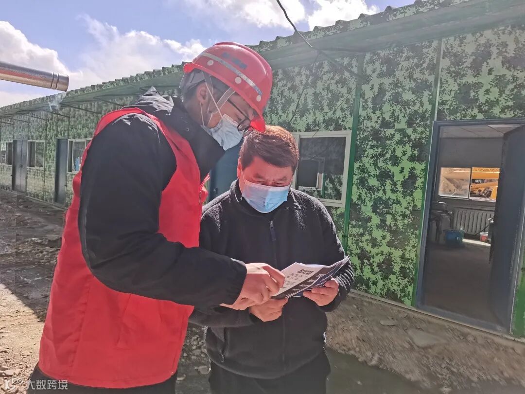 青海同赛项目前往民工驻地,开展疫情防控消毒和防疫小知识宣传活动。