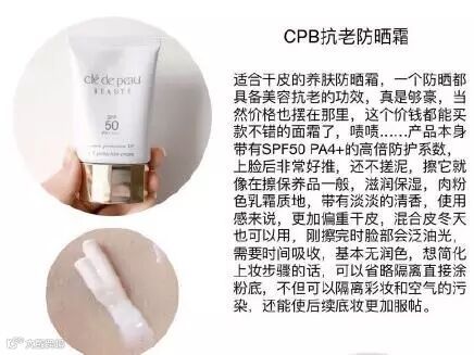 CPB 肌肤之钥 防晒霜,奢侈舒适的使用感和香味,防止紫外线的同时进行抗衰保养,防止所有紫外线对肌肤的损害,既是防晒产品又是保养品。滋润保湿的使用感,提升后续肌肤质感,适合所有肤质使用。