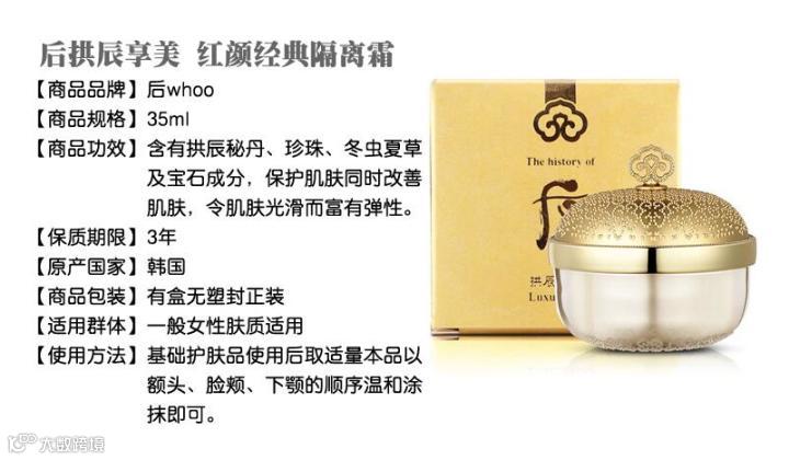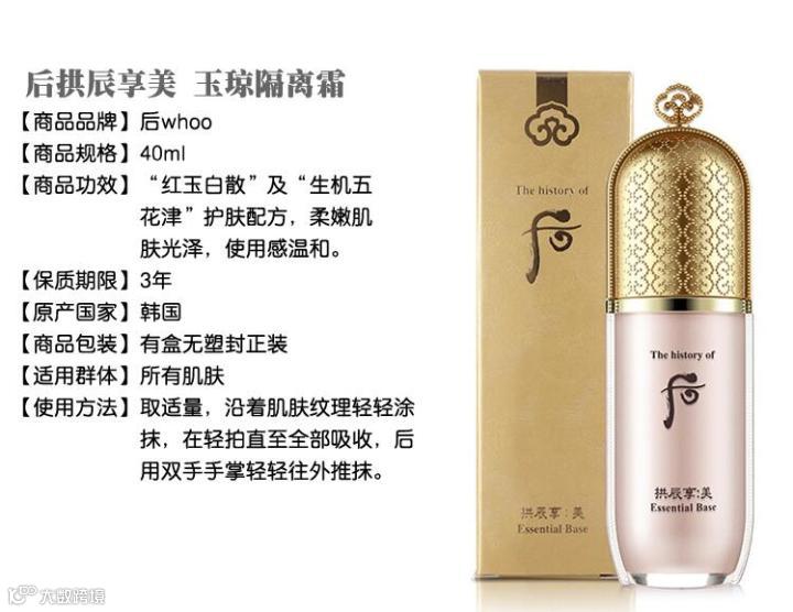 WHOO后精华隔离霜!涂上去瞬间你就会知道什么是精华隔离, 隔离掺在精华里,超级滋润!!WHOO后拱辰享精华隔离,保湿、自然、滋润、透气、不会卡粉、不会厚重,淡淡的修饰肤色, 精神显得很好,本品含有高浓缩拱辰丹与皇室珠宝的成分,皮肤变得温润光滑,白皙透明,提亮肤色。