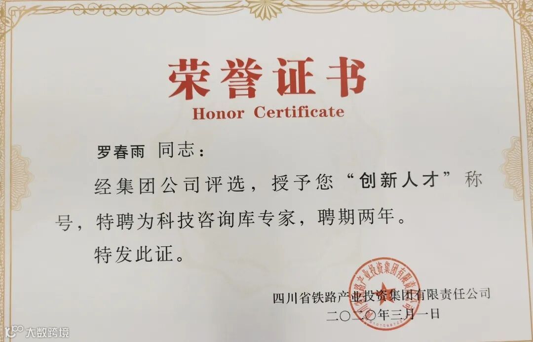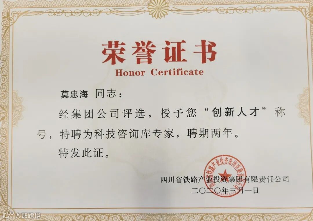 为全面贯彻《四川省铁路产业投资集团公司激励科技人才创新十条措施》,落实“创新人才”激励政策,经过严格审核,铁投集团认定26名同志为第一批创新人才,四川路桥公路隧道分公司罗春雨、王华玲、莫忠海、赵刚应4人入选创新人才名单,同时聘为铁投集团科技咨询库专家,聘期两年。