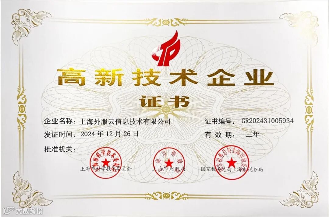 高新技术企业证书由上海市科学技术委员会、上海市财政局、上海市税务局联合颁发,该资质有效期为三年,到期需重新认定。本次过审,不仅体现了外服云在自主创新领域的持续突破与成长潜力,更彰显上海外服在人力资源数字科技领域的创新力与专业度。