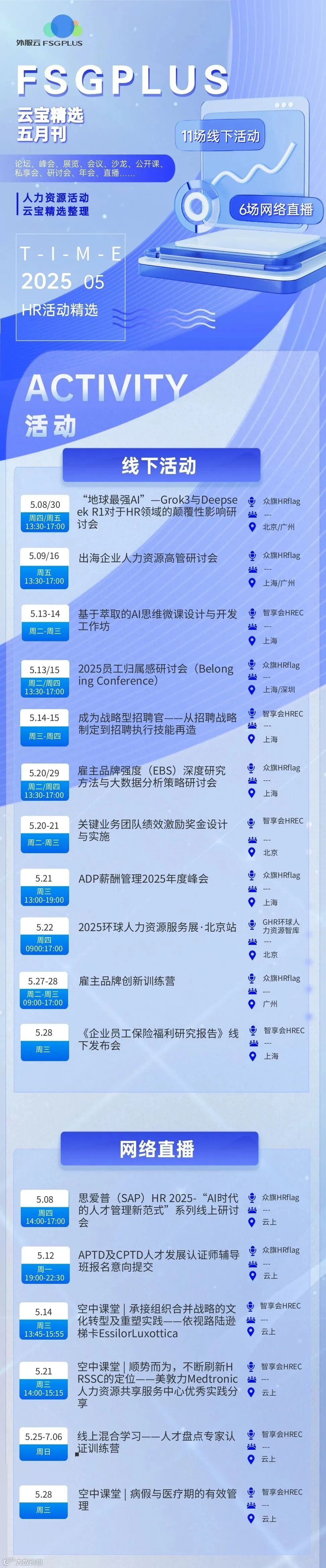 云宝整理了5月全国(部分)人力资源行业活动日期及举办地点、预计人数,供各位企业HR参考。