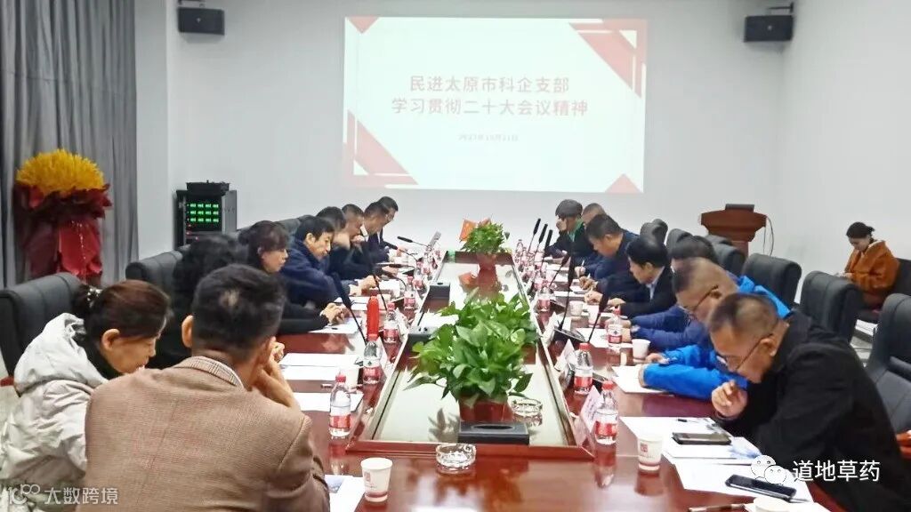 10月21日下午,民进太原市科技企业支部在道地草药(山西)国际贸易港会议室专题学习党的二十大精神,民进太原市委会副主委杜海柱、温双伟,组织部长陈洁应邀参加。会议由支部主委吴健宏主持,支部宣传委员王锦龙就二十大报告中习总书记提出的“三个务必”进行详细解读,与会会员踊跃交流发言,共同学习,畅谈体会。