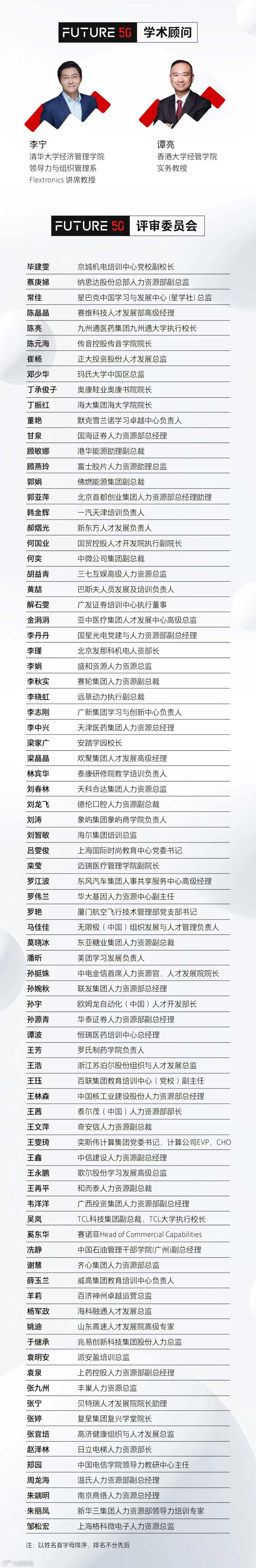 为确保评选的专业性、权威性与前瞻性,本届评选由2位组织发展与领导力领域的学者担任学术顾问,以及80+企业专家担任评审委员,他们将以卓越洞察力,甄选未来管理人才培养年度标杆企业和最佳项目,共同推动中国企业人才培养的创新与发展。