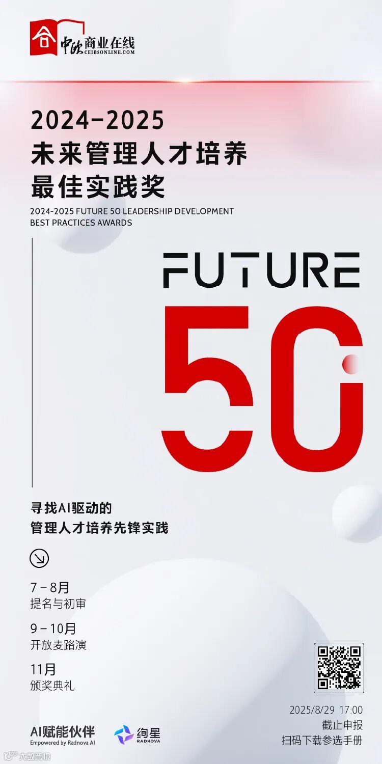 中欧商业在线自2014年起,携手多家优秀企业发起“TOP20 最佳企业实践奖”,持续见证企业以学习驱动变革、以人才撬动未来。十年探索,如今站在AI重塑商业格局的临界点,奖项全面升级为「FUTURE 50未来管理人才培养最佳实践奖」,持续发掘中国企业的人才培养标杆,表彰数智时代组织学习的突破性实践,深度探索智能技术驱动下的管理人才发展新模态与先锋实践。