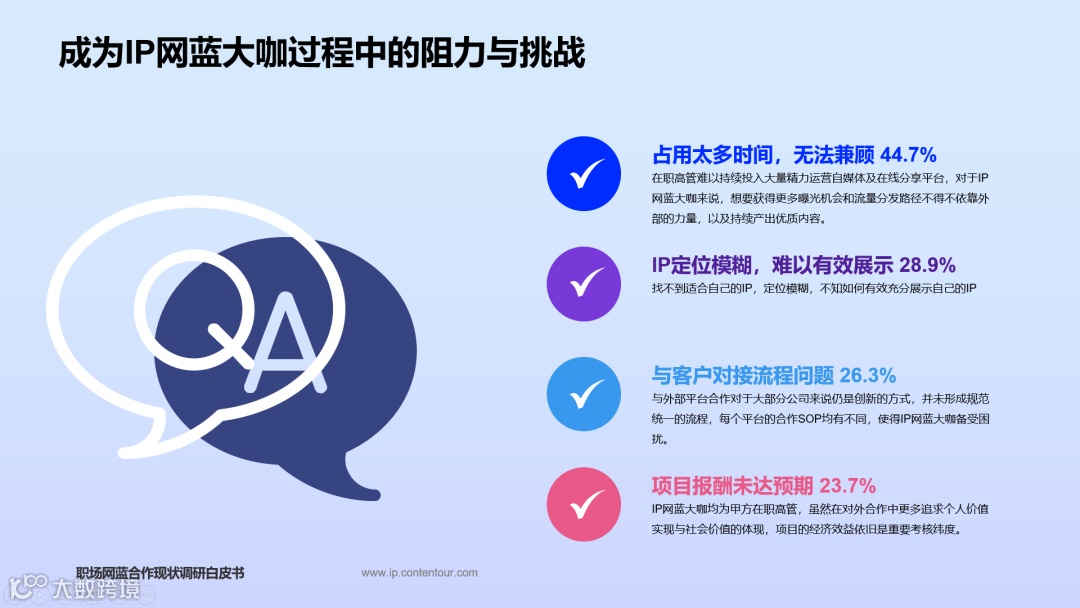 作为资深的项目顾问,Bear 沟通过数十位IP网蓝大咖,了解大咖在合作项目落地时的具体难点和疑惑, 他总结了当前个人IP运营中面临的痛点,并提出“无边界的团队合作”和“数字化”是IP合作未来方向。