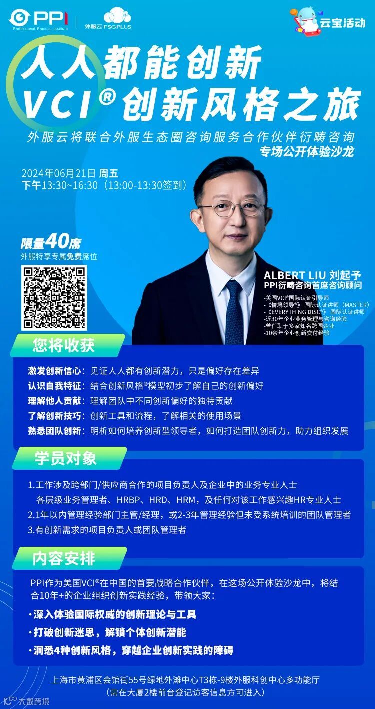 2024年6月21日,外服云将联合外服生态圈咨询服务合作伙伴衍畴咨询(简称“PPI”)开设“人人都能创新-VCI®创新风格之旅”专场公开体验沙龙,在本次活动现场,您将有机会深入体验来自40年权威创新体系的创新测评工具与模型,理解创新风格理论,体验创新是如何从想到做,提升组织人效,培养起团队的创新氛围与土壤。