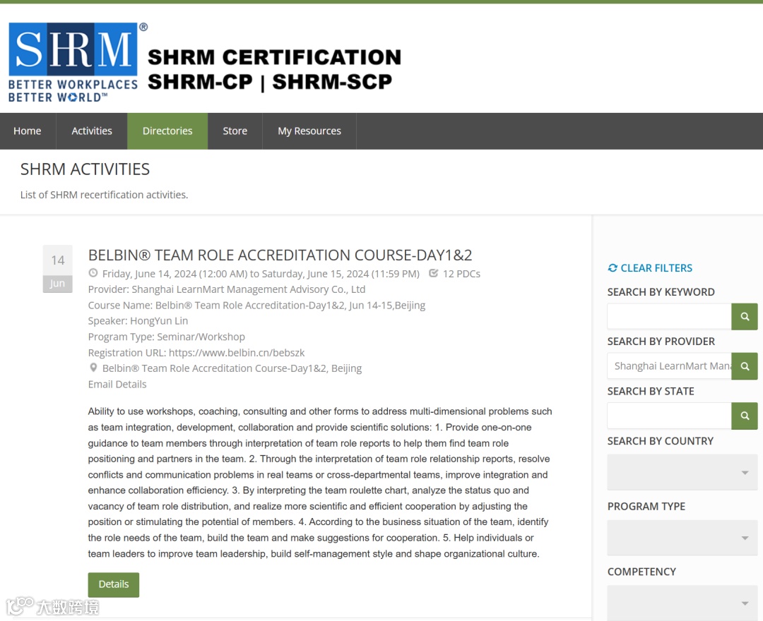 您可至SHRM官方再认证提供商查询网站找到我们,在Keyword关键词输入:learnmart,点击跳转查询接下来即将开班的大中华区贝尔宾®授证课程: