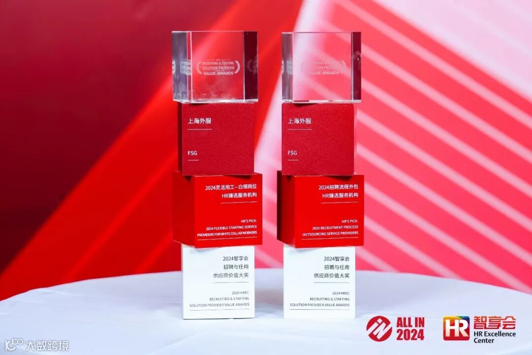9月4日至5日,“ALL IN 2024人力资源服务展-上海站”智享会人力资源供应商价值大奖”荣耀在沪揭晓。上海外服凭借卓越的服务能力和丰富的人力资源管理经验,成功获得了六项大奖,这一系列奖项不仅是对上海外服专业水平的高度认可,也进一步彰显了上海外服在人力资源领域的行业领军地位。
