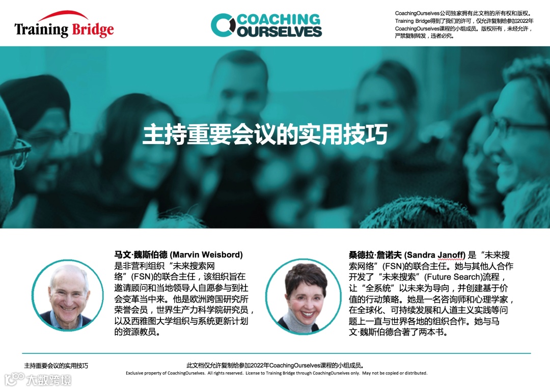 *本文主要观点来源于CoachingOurselves 主题之《主持重要会议的使用技巧》,该主题作者为马文·魏斯伯德和桑德拉·詹诺夫