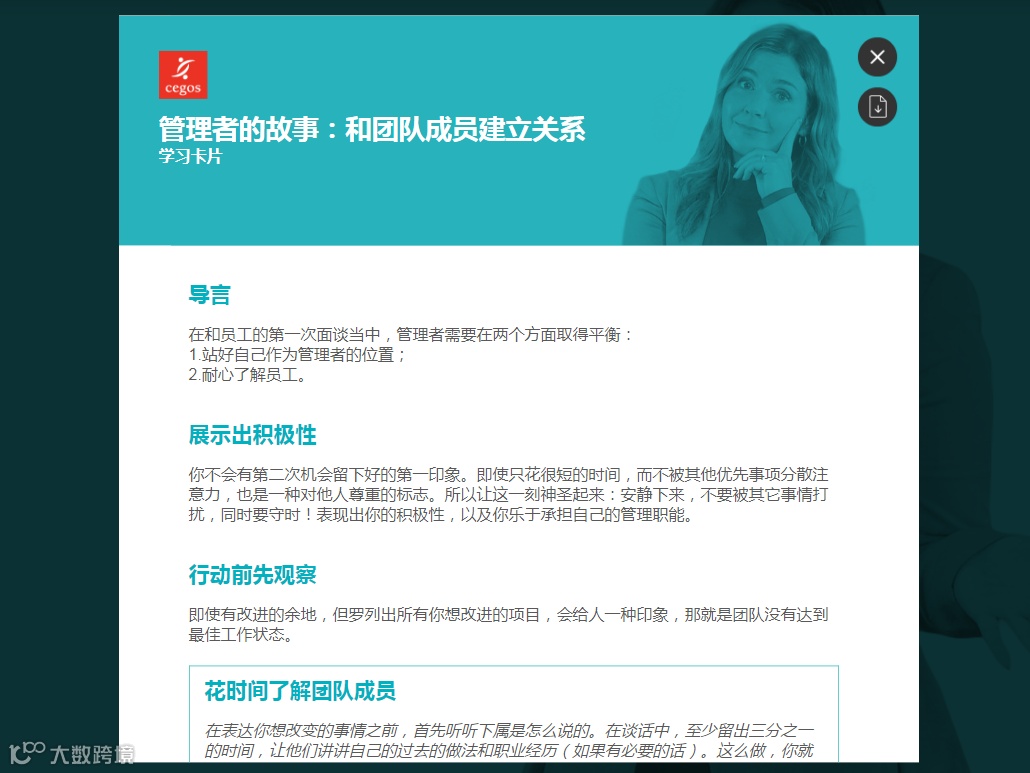 《新经理百日真人秀》为系列沉浸式互动视频课程,总共13集(课)。具体的场景,包括凯拉和员工以及和上级的一对一面谈、凯拉主持的会议等等。