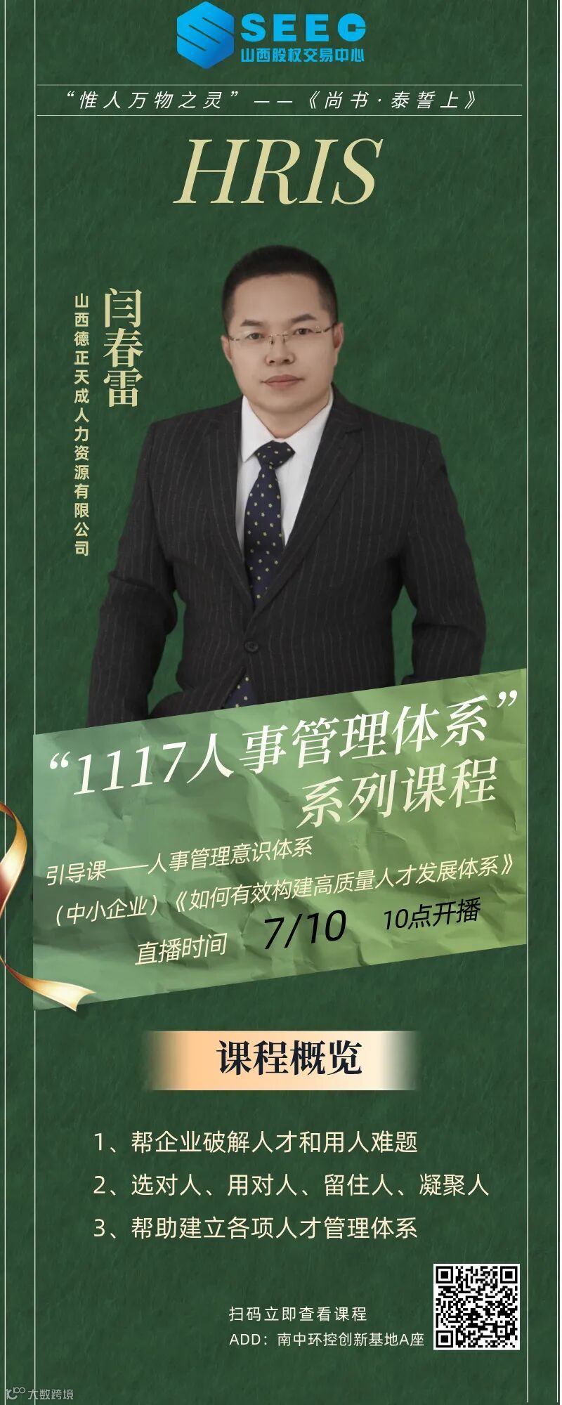 为帮助企事业单位提升人力资源管理专业水平,增强HR从业者的核心技能,山西股权交易中心联合山西德正天成人力资源有限公司特开展线上“1117人事管理体系”系列课程。本次培训由资深人力资源专家授课,结合实战案例,系统讲解人力资源管理核心内容,助力企业掌握最新工具与方法,提升职业竞争力,现将有关事项通知如下: