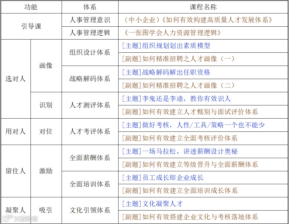 从人才发展、人力资源工作实操出发,围绕人事管理意识、人事管理逻辑、组织设计体系、战略解码体系、人才测评体系、人才考评体系、全面薪酬体系、全面培训体系、文化引领体系,针对不同基础的人力资源从业者提供人力资源专项培训服务,全面提升人力资源从业者的职业技能。