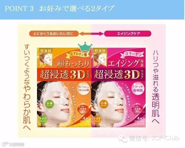 无香料,无着色,弱酸性,一般面膜很难兼顾到鼻翼周围的部分,但是这款最新3D立体剪裁服贴无缝隙!润泽柔软包覆全脸,更能紧贴鼻翼两侧、眼周及下巴肌肤。含蜂王乳、大豆异黄酮、虾红素成份,导入深层角质,使肌肤饱水润泽。超细小分子易吸收,清爽无黏腻感,还有收缩毛孔的效果。