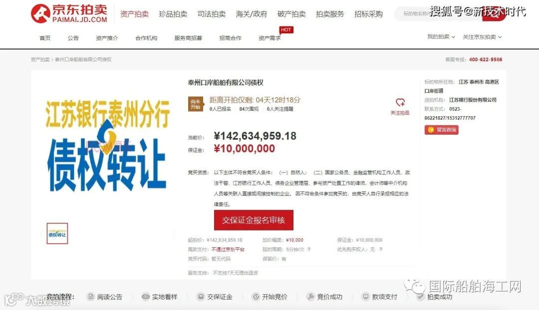 江苏银行股份有限公司公告(以下简称“江苏银行”)定于2020年9月29日10:00时起至2020年9月30日10:00时止(延时除外)在京东网资产竞价网络平台(网址http://zichan.jd.com)对曾经风光的著名民营船厂泰州口岸船舶有限公司债权,以1.4亿多元人民币起价进行公开竞价拍卖。