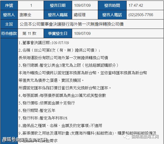 长荣海运7月9日发布公告称,董事会决议发行“海外第一次无担保转换公司债”,暂定以美金3亿元为上限(包括超额认购部分),发行期限暂定为五年。公告称,所筹集资金,主要用以满足该公司在购买船舶燃料、购置船舶与船舶设备,以及承租船舶等方面的资金需求。