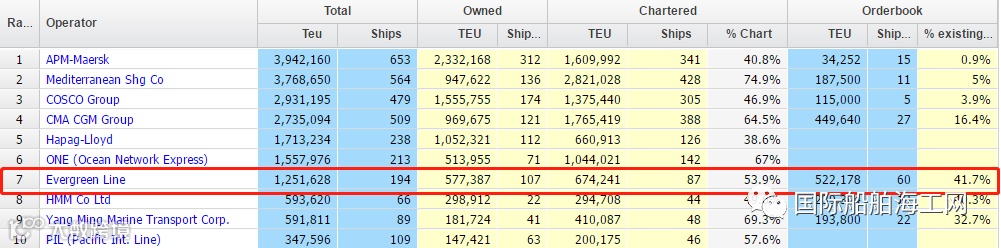 运力方面,根据Alphaliner7月13日的统计数据,长荣海运现有总运力125万TEU,其中租赁运力占53.9%。目前其拥有新船订单60艘,是所有船公司中最多的。订造运力约52万TEU,占其现有运力的41.7%。