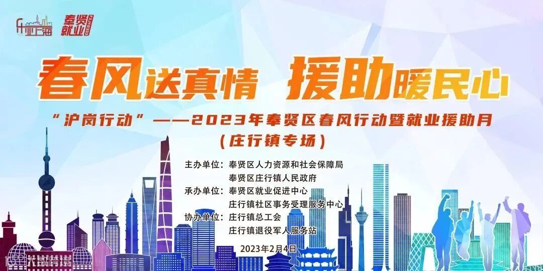 为搭建企业与求职者交流的互动平台,奉贤区将于2023年2月4日(周六)上午9:00时举行“沪岗行动”—2023年“春风送真情 援助暖民心”奉贤区春风行动暨就业援助月庄行镇专场招聘会