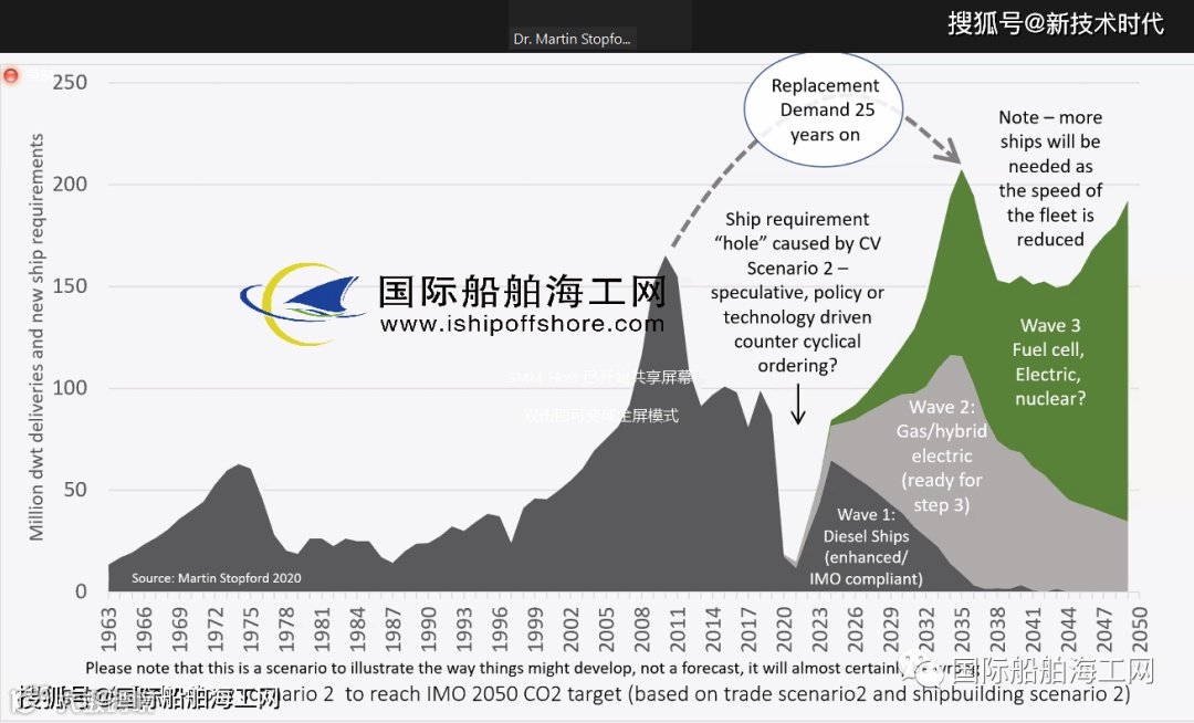 受疫情影响,造船市场低迷期过后,对采用最新技术的船舶需求将迅速增长。2021年新造船需求或出现短暂的急剧收缩,但随后的新造船需求将达到20世纪30年代初2.5亿载重吨的增长峰值。这将依靠零碳排放的推进系统,以满足IMO 2050碳排放目标。但如果21世纪20年代出现大量的因船舶不符合相关公约要求或因为市场不景气造成的被动拆船,那么达到峰值的条件将有所调整。