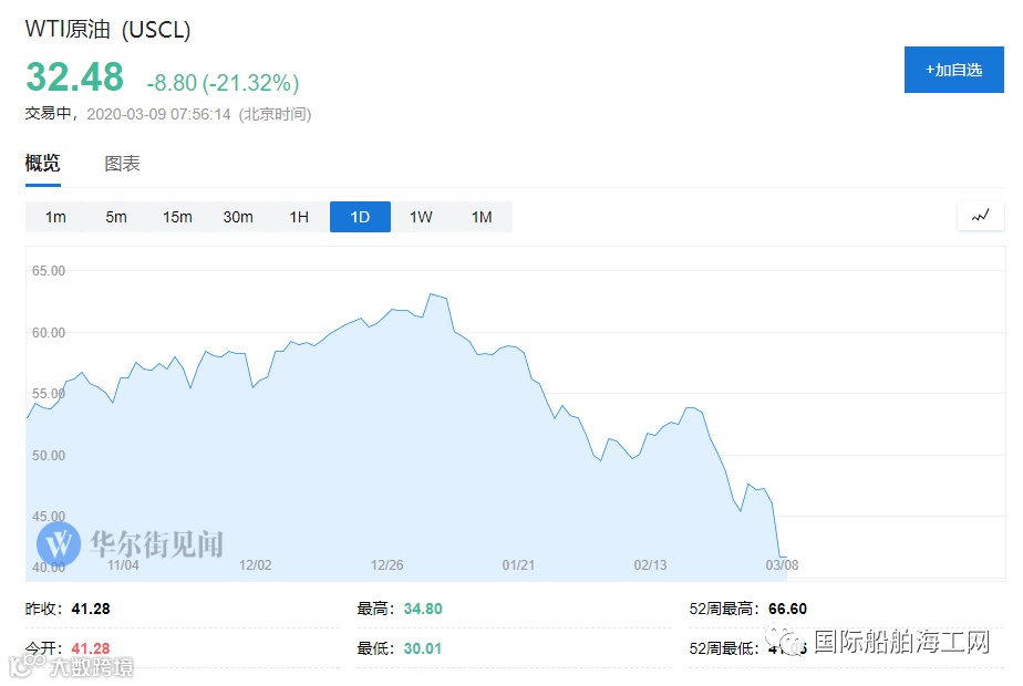 周一(3月9日)亚市早盘,布伦特大跌逾31%,WTI原油则跌超27%。油价上周已经出现了金融危机以来最大的跌幅。洲际交易所(ICE)5月交割的布伦特原油期货价格一度下跌14.25美元,至31.02美元/桶。此前,受新冠病毒影响,2020年全球原油市场的需求已经被大幅下调。美国高盛预测如果事件持续,今年2-3季度油价可能将暴跌至30美元/桶,并有可能触及的20美元/桶的关键关口,国际油价将降到20美元每桶。
