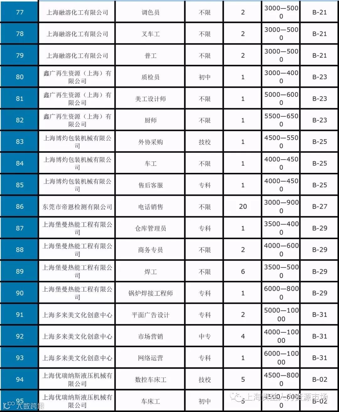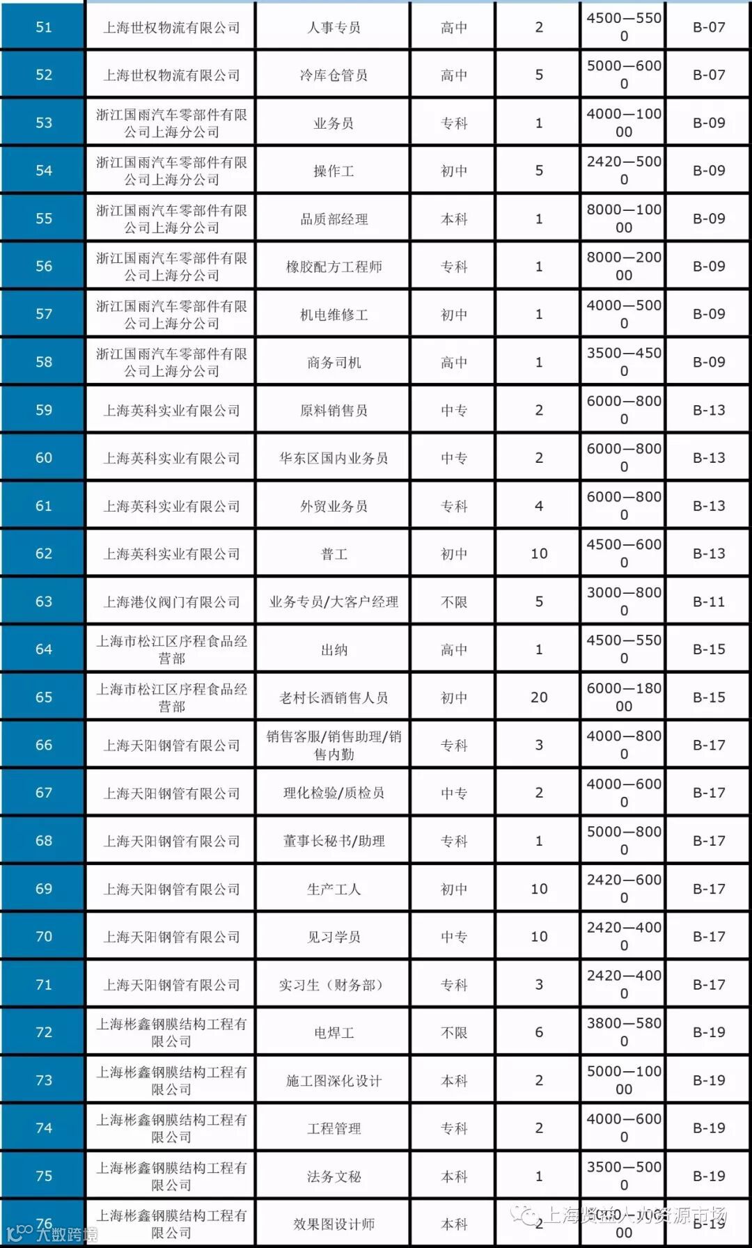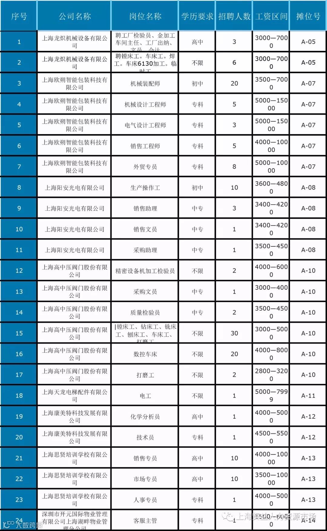 上海外服贤益市场2019年3月23日上午举办2019年3月奉贤区人力资源市场招聘会,招聘岗位包括行政文员、法务文秘、董事长秘书、模具工、电焊工、生产管理仓库管理员、采购员、电器工程师、电气工程师、机械设计、平面广告设计、文案策划、检验员、机修工、电工、保安、装配、水电工、钣金工、普工、电焊工、包装工、大堂助理、财务、统计员、驾驶员等95余个岗位,招聘人数390余人,岗位具体安排如下: