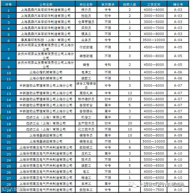我区将于2018年10月20日上午举办2018年10月 奉贤区公益招聘会,本次活动预计参会企业80家,招聘岗位包括检验员、仓库管理员、采购员、模具工、电焊工、客服前台、机修工、生产技术员、化工技术员、数控、压机工、电工、铸造工、车床工、电信营业员、储备机长、印前制作、保安、装配、水电工、绿化工、钣金工、电气设计、机械设计、生产管理、包装工、美工、大堂助理、日语翻译、行政文员、财务、前台、化学分析员、统计员、法务、文案、模具工、物流专员等400余个岗位,活动具体事宜如下: