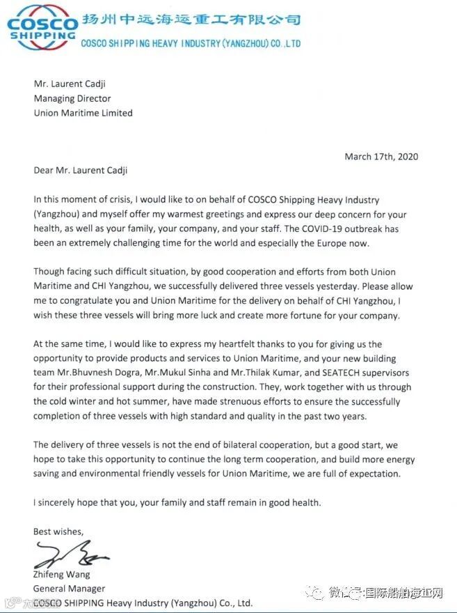 3月17日,扬州中远海运重工为英国船东Union Maritime Limited建造的3艘6.4万吨散货船(N871、N872、N873)同时交付后的第二天,扬州中远海运重工便收到该项目船东现场监造组经理Mr.Martin Adams发来的感谢信。