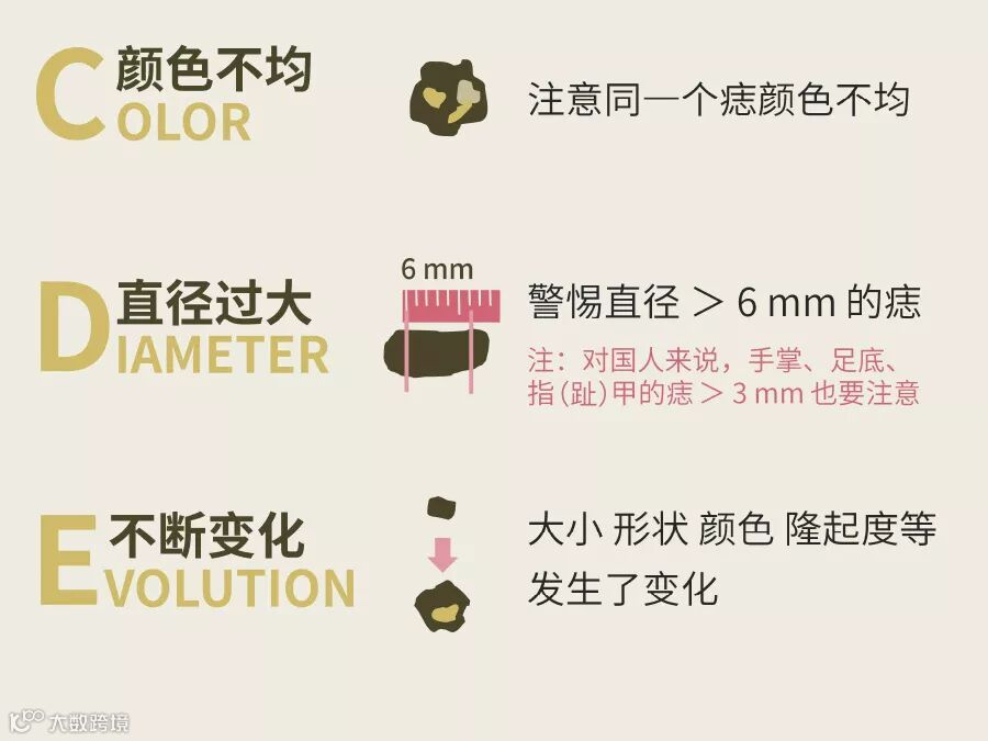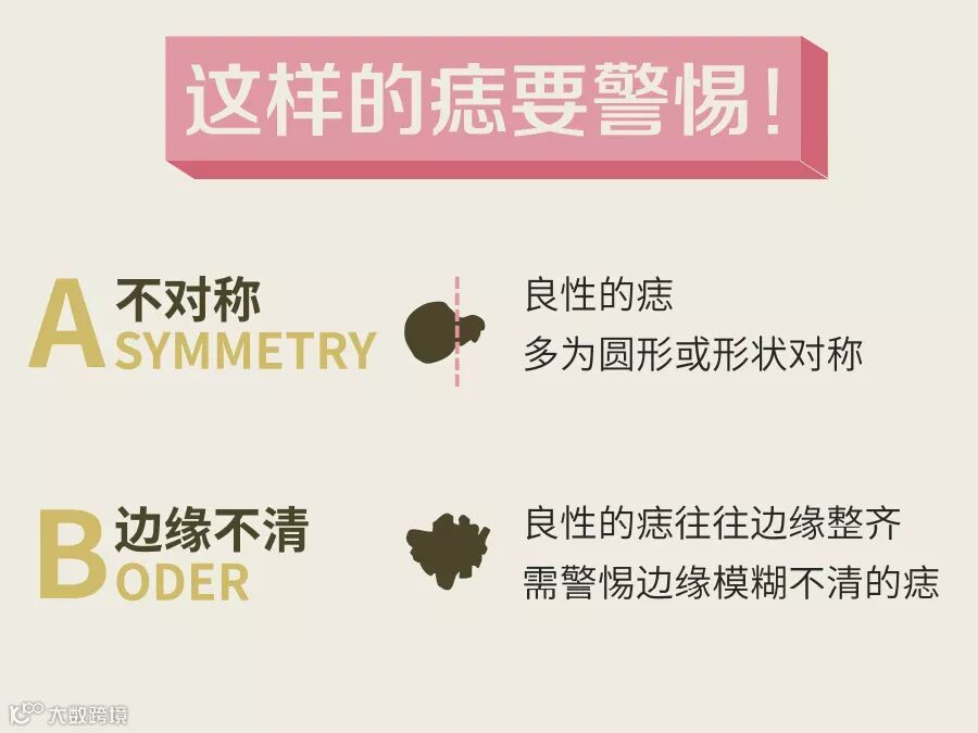 有些痣,因为长得地方不对,或者颜色、大小有问题,就可能有癌变的风险。一定要提高警惕。