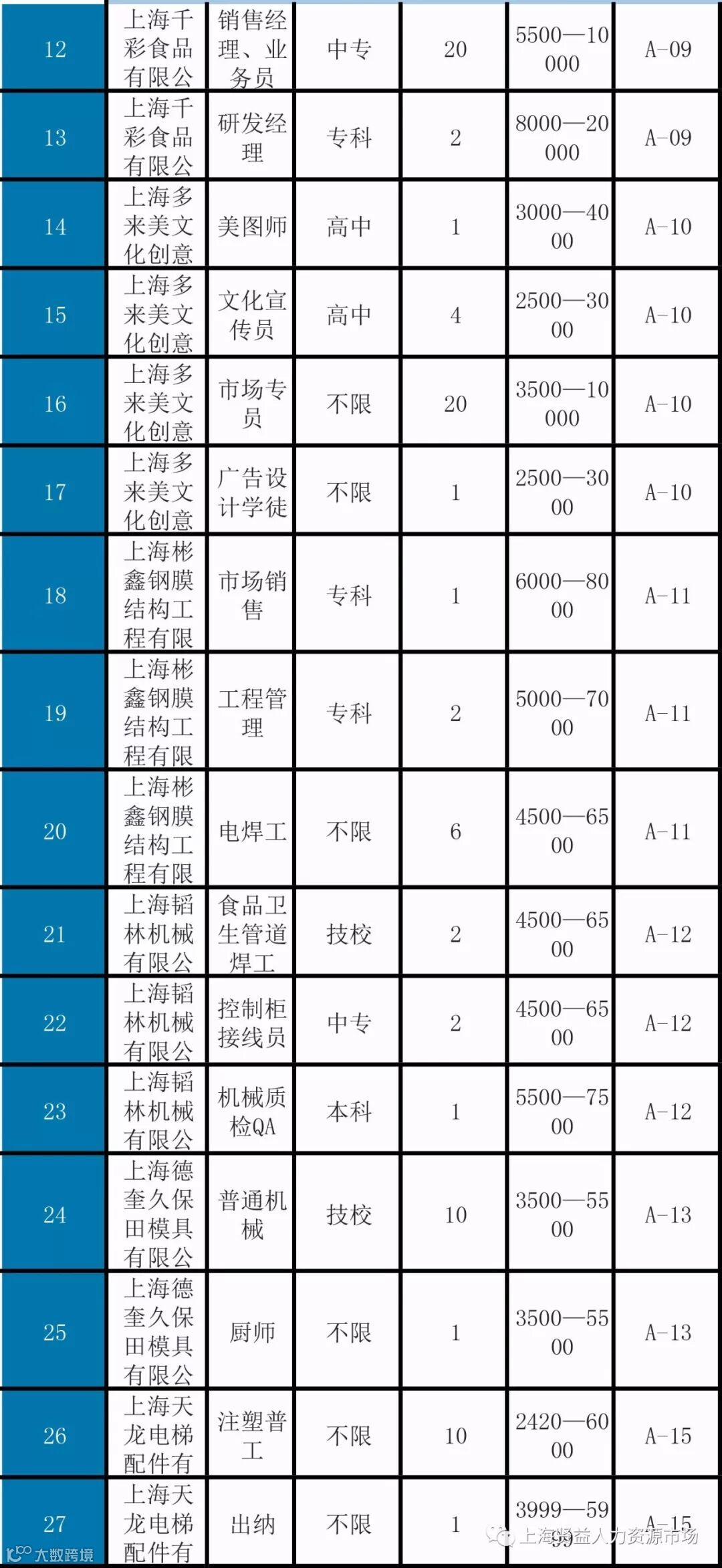 我区将于4月27日上午在人力资源市场举办招聘会,招聘岗位包括:研发经理 、人事行政主管、设计研发人员、销售助理、工程管理、仓库管理员、出纳、采购助理、电焊工、铆工、操作工、车床床工、包装工、水电工、钣金工、普工、机修工、压机工、电工、装卸工、装配、厨师、驾驶员等56个岗位, 活动具体事宜如下: