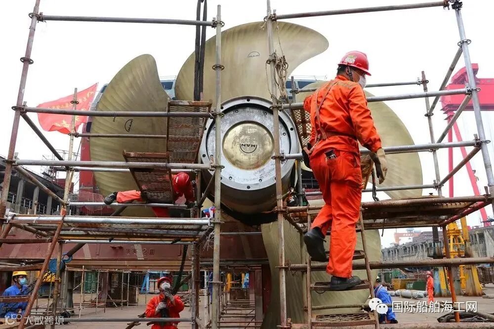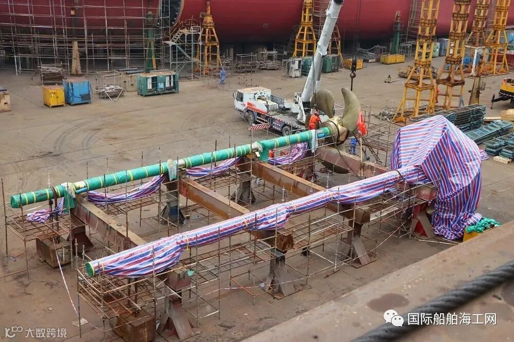 艉轴和螺旋桨已经在现场组装,马上就要开始进行穿轴作业。