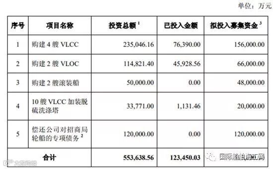 其中,购建4艘VLCC拟投入募集资金15.6亿元,购建2艘VLOC拟投入募集资金6.6亿元,购建2艘滚装船拟投入募集资金4.8亿元,10艘VLCC加装脱硫洗涤塔拟投入募集资金3亿元,此外还将偿还对招商局轮船的12亿元专项债务。这些项目合计投资总额55.36亿元,已投入金额12.35亿元,拟投入募集资金41亿元。