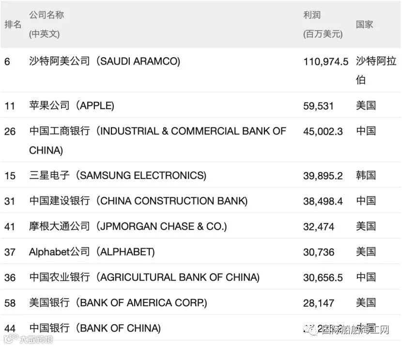 《财富》的世界500强是按照营业收入来排名的,但更要看盈利能力。在这方面,沙特阿美以近1110亿美元的超高利润登顶利润榜首位,苹果位列第二。利润榜前10位的四家中国公司仍然是工建农中四大银行,谷歌母公司Alphabet则以年度142.7%的利润增长率成功跻身前十强,位列第七。