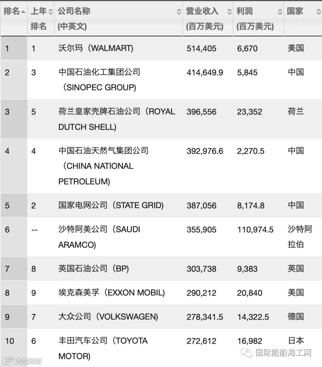 沃尔玛连续第六年成为全球最大公司,中国石化位列第二,壳牌石油上升至第三位,中国石油和国家电网分列第四、第五位,新上榜的巨型石油公司沙特阿美则位居第六位。