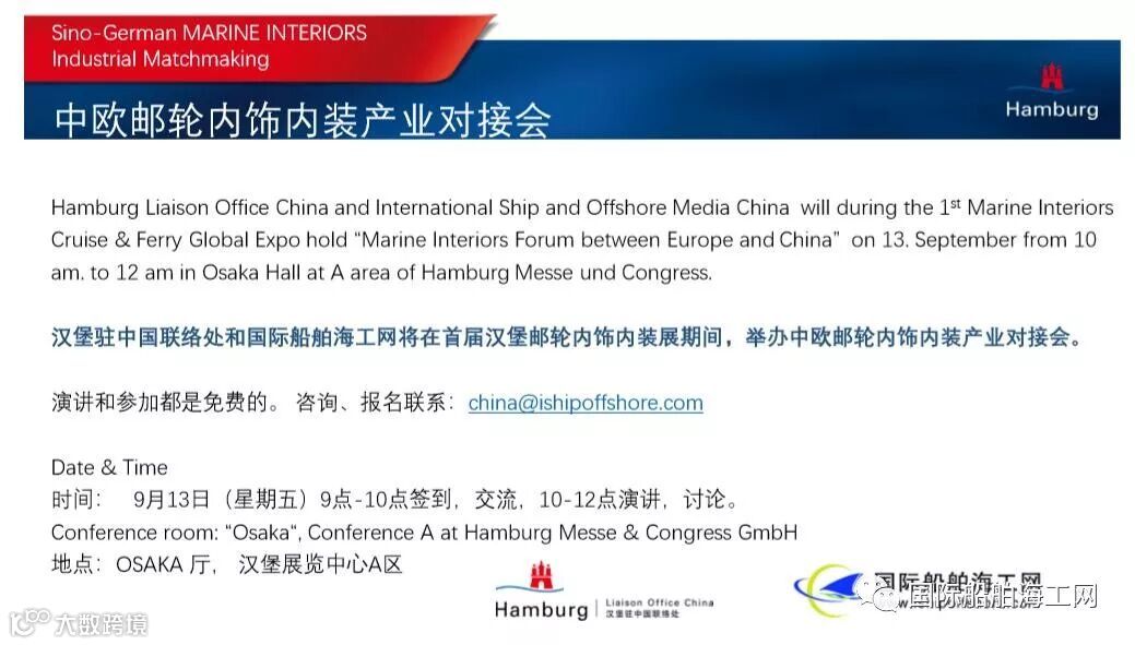 全球船舶海工产业界瞩目的2019欧洲邮轮展和德国首届邮轮内饰内装展(www.marineinteriors-expo.com)将于2019年9月11日至13日在德国汉堡SMM展览馆内同期举行。在德国首届邮轮内饰内装展主办方支持下,德国汉堡驻中国联络处和总部上海的国际船舶海工网将在首届汉堡邮轮内饰内装展期间,定于9月13日上午,在展览馆内的大阪厅,联合举办“中欧邮轮内饰内装产业对接会”,双方将邀请中外权威和专家演讲和出席对接交流会。该会全程对专业观众免费,欢迎报名参加,也欢迎提交好的演讲课题供组织方择优挑选,都是免费参加和免费演讲。