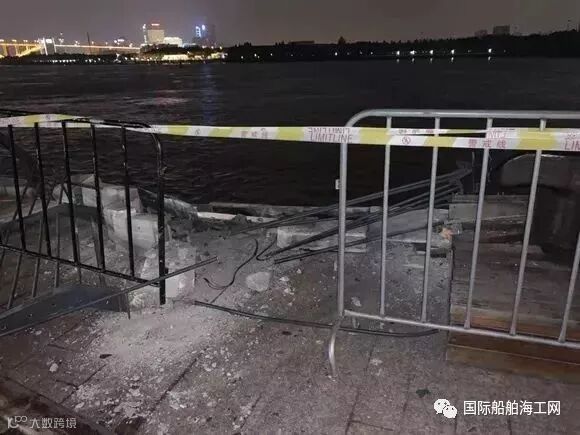 据东方网报道,当晚记者赶到现场看到,靠近江岸的栏杆已被撞毁。现场设置了隔离栏。