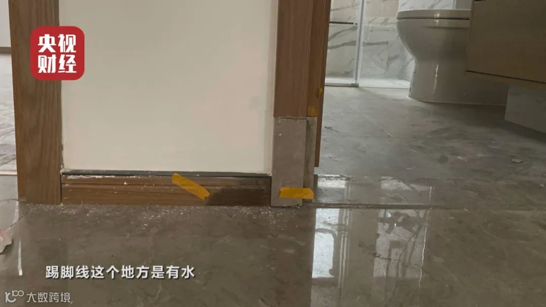 这样所谓的精装修,实在令业主们头疼。地板变黑可以更换,但是有的问题,就没那么好解决了。一些业主家做了蓄水测试后,卫生间外墙出现了渗水现象,问题相当普遍。有渗水的,还有直接从墙里不停地往出喷水。