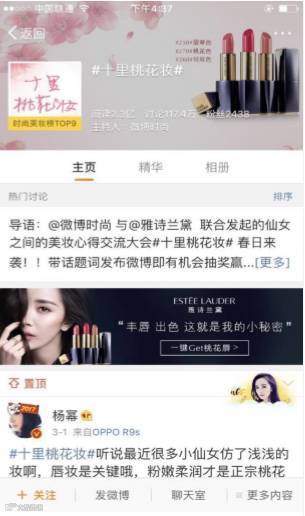 2月23日微博时尚垂直频道联合雅诗兰黛官方发起十里桃花妆仿妆大赛,通过优势渠道进行各路传播,后生成大量UGC。2月27日30位高形象力KOL为雅诗兰黛品牌定制专属视频进行软广联动。3月1日大结局,《三生》衍生定制款宣传资料亮相微博开屏,于此同时,雅诗兰黛发布品牌定制口红,杨幂首发微博,kol配合传播,极大提高了话题互动及阅读量,话题登顶热搜。随后官方微博转评相关kol内容,对优质内容进行盘点。