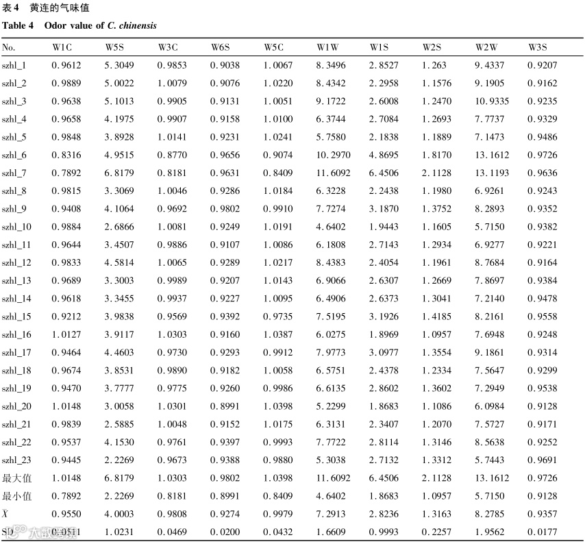 由表3可知:石柱产黄连在主要气味值上一等级大于二等级、二等级大于三等级,人体所感受到的气味一等级也明显大于二、三等级。表明石柱产黄连的外观性状值对其气味值有一定影响。由表4可知:石柱产黄连的10个气味传感器响应值中,W1W、W2W响应最明显,其次是W5S、W1S,剩余6个传感器的响应值较小。