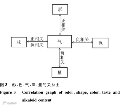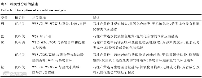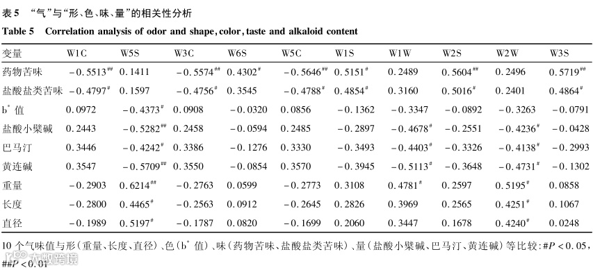 以石柱产黄连“气、形、色、味、量”结果中各指标值,采用SPSS22.0统计软件,进行相关性分析,结果见表5。“气”与“形、色、味、量”各指标值间的相关性结果见表6。综上,石柱产黄连的气味值与外观、颜色、味道、生物碱含量均具显著的相关性,故石柱产黄连的气味值对药材的品质评价具有重要意义,证明了石柱产黄连气味检测的必要性。