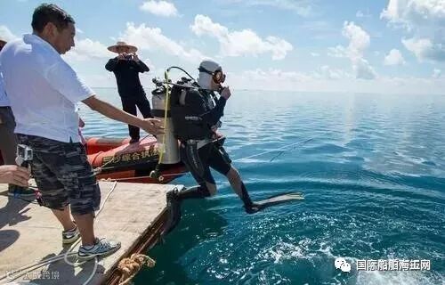 图为海洋专家穿潜水服对三沙永乐龙洞进行水下探查。
