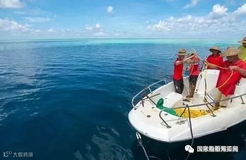 科学考察船在蓝洞洞口进行研究考察。