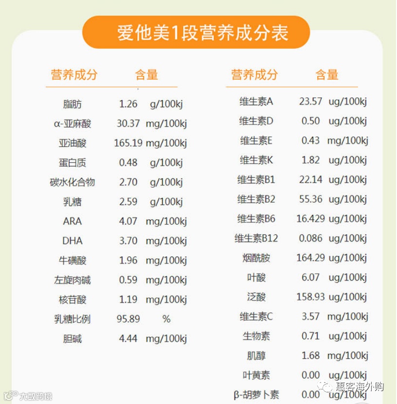 不同国家爱他美奶0-粉6个月阶段营养元素对比结果如下: