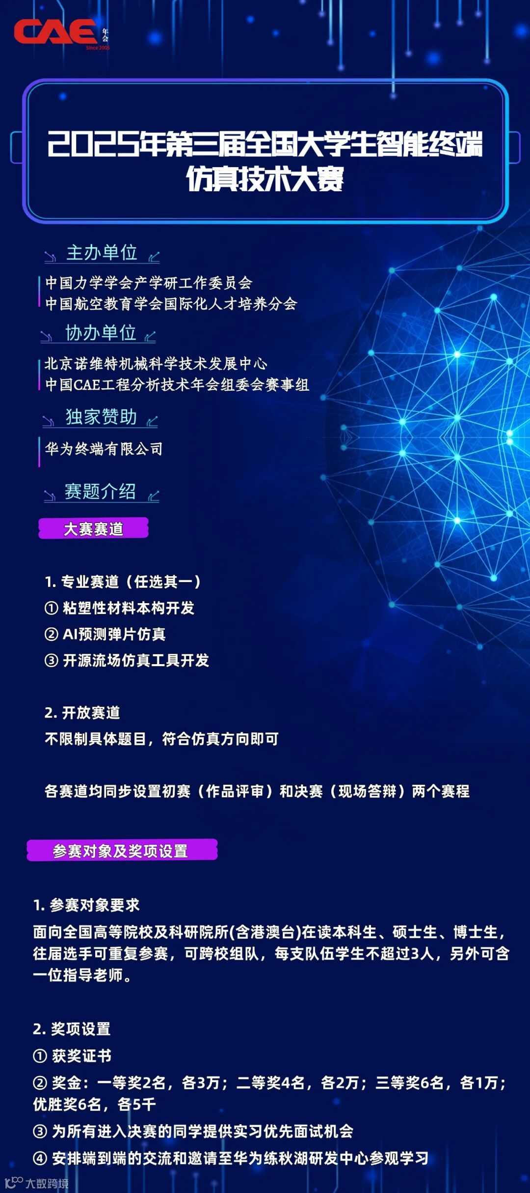 详细介绍第三届仿真技术大赛包括赛题、赛程以及奖项设置等。本次大赛赛题涉及材料本构、AI+仿真、仿真智能服务开发、多物理场仿真等方向。大赛设有丰厚奖金,还有华为实习优先面试机会、端到端的交流安排,以及前往华为练秋湖研发中心参观学习的机会。