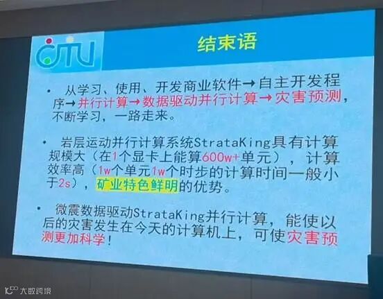 本人的报告《用于灾害预测的微震数据驱动并行计算系统》介绍了历时15年自主研发的岩层运动GPU并行计算系统StrataKing(计算规模大、计算效率高和矿业特色鲜明,例如,丰富而实用的支护功能)及岩层运动并行计算研究进展,介绍了临界应力的概念,其为结构的极限承载能力,在现场无法测量,只能通过计算获得。根据冲击地压扰动响应失稳理论,一旦临界应力达到,冲击地压发生。重点介绍了微震数据驱动StrataKing并行计算预测巷道冲击地压的研究成果。此外,还介绍了科学普及和传播等相关内容。
