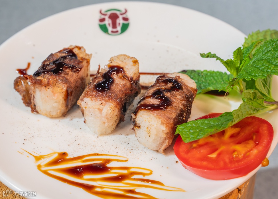 用鲜美的大片肥牛裹上香软的寿司饭团,再经过铁板的煎烤,肥牛本身的鲜美,再加上煎烤以后滋滋冒油的香味,一口下去,米香、肉香、和本身食材鲜香的丰富口感融合在一起,一口一口,满足大家的主食欲望~