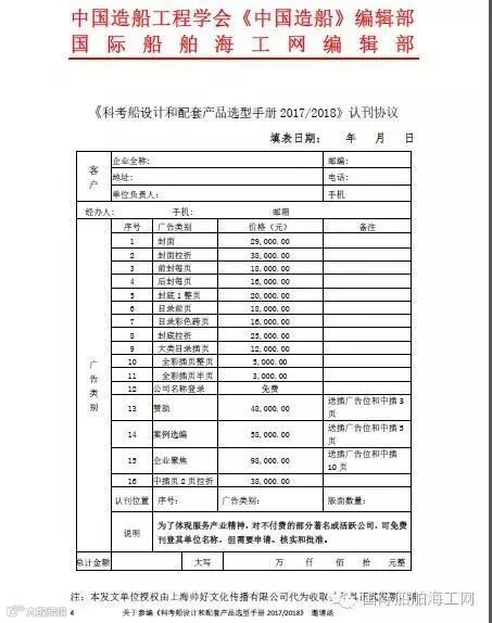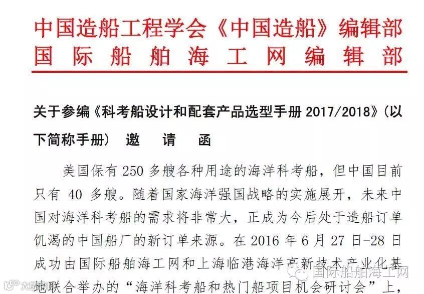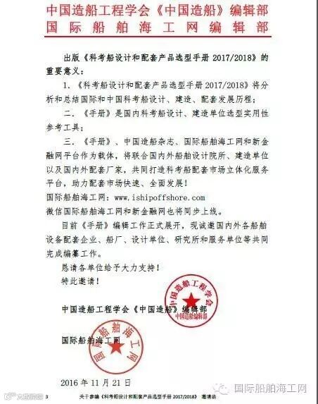 同时针对目前中国科考船建造热和规划热,国际船舶海工网还与造船届著名的刊物团队中国造船工程学会《中国造船》编辑部等单位合作,将联合组织国内外行业专家,编辑发布《科考船设计和配套产品选型手册2017/2018》(以下简称《手册》)。