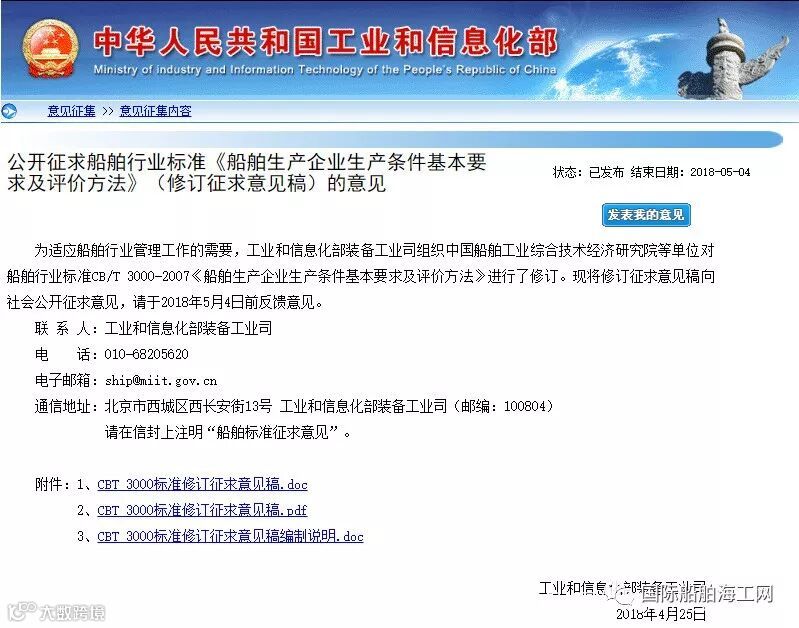 为适应船舶行业管理工作的需要,工业和信息化部装备工业司组织中国船舶工业综合技术经济研究院等单位对船舶行业标准CB/T 3000-2007《船舶生产企业生产条件基本要求及评价方法》进行了修订。现将修订征求意见稿向社会公开征求意见,请于2018年5月4日前反馈意见。