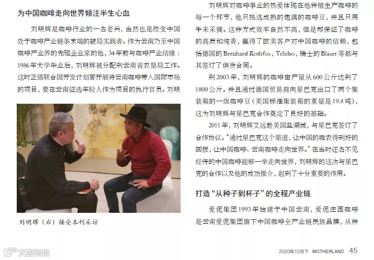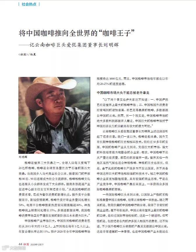 云南爱伲农牧(集团)有限公司董事长刘明辉接受《祖国》杂志记者采访,原文刊载于2020年12月下期。