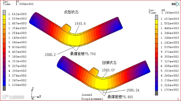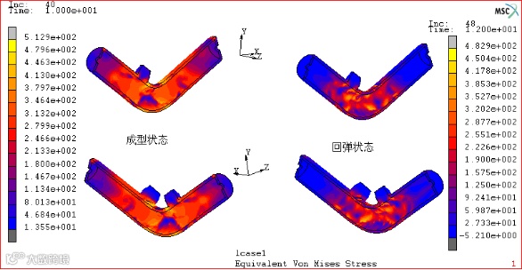 管件成型和回弹等效应力分布如图8示,左为成型状态,右为回弹状态。成型时,最大等效应力约。回弹后,应力最大值仍有。说明卸载后,管件有很高的残余应力,必须进行退火等处理以消除内应力。