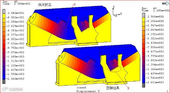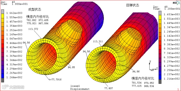 管件保压状态和回弹状态在模具中的情况如图5示,左上是保压状态,右下为回弹状态。